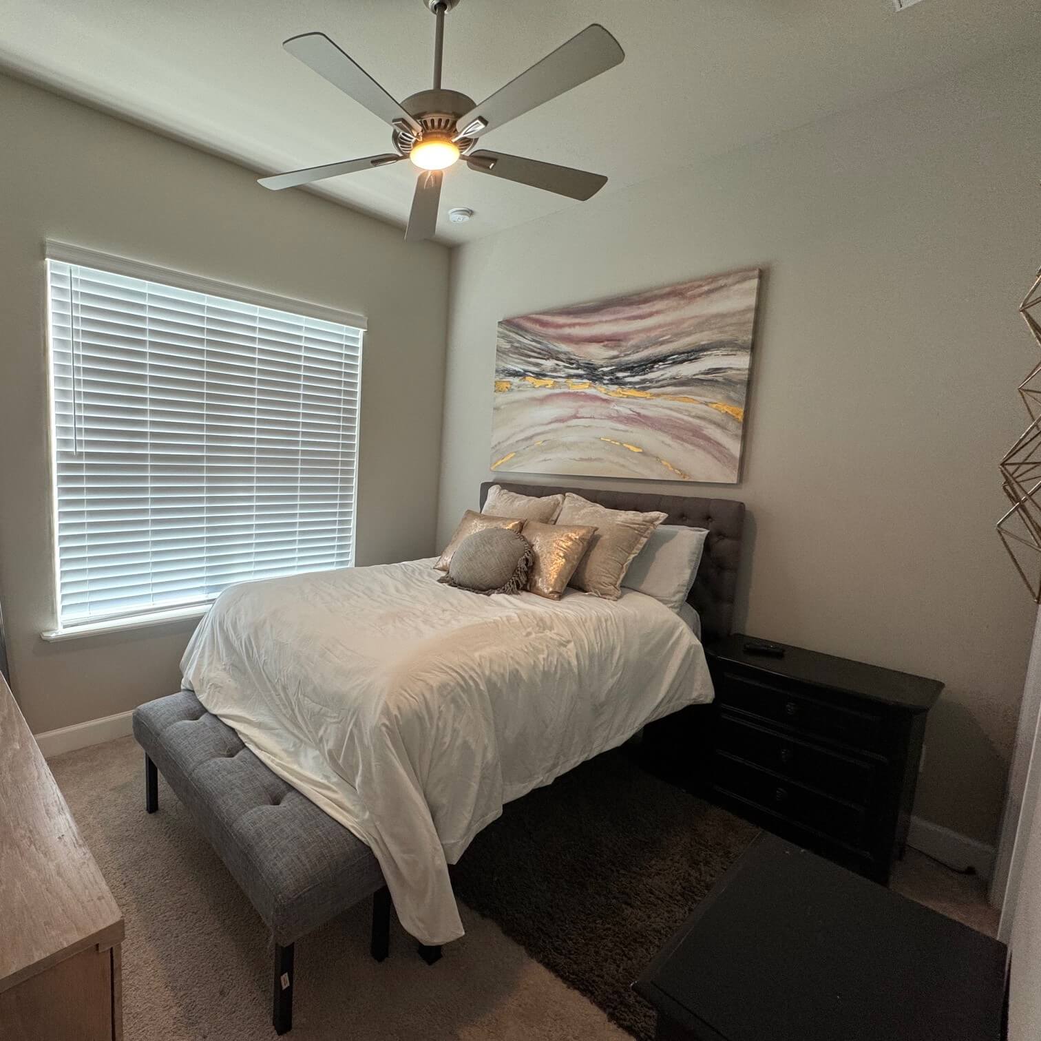 - Flooring: Wood-like tile throughout, except for cozy, carpeted bedrooms