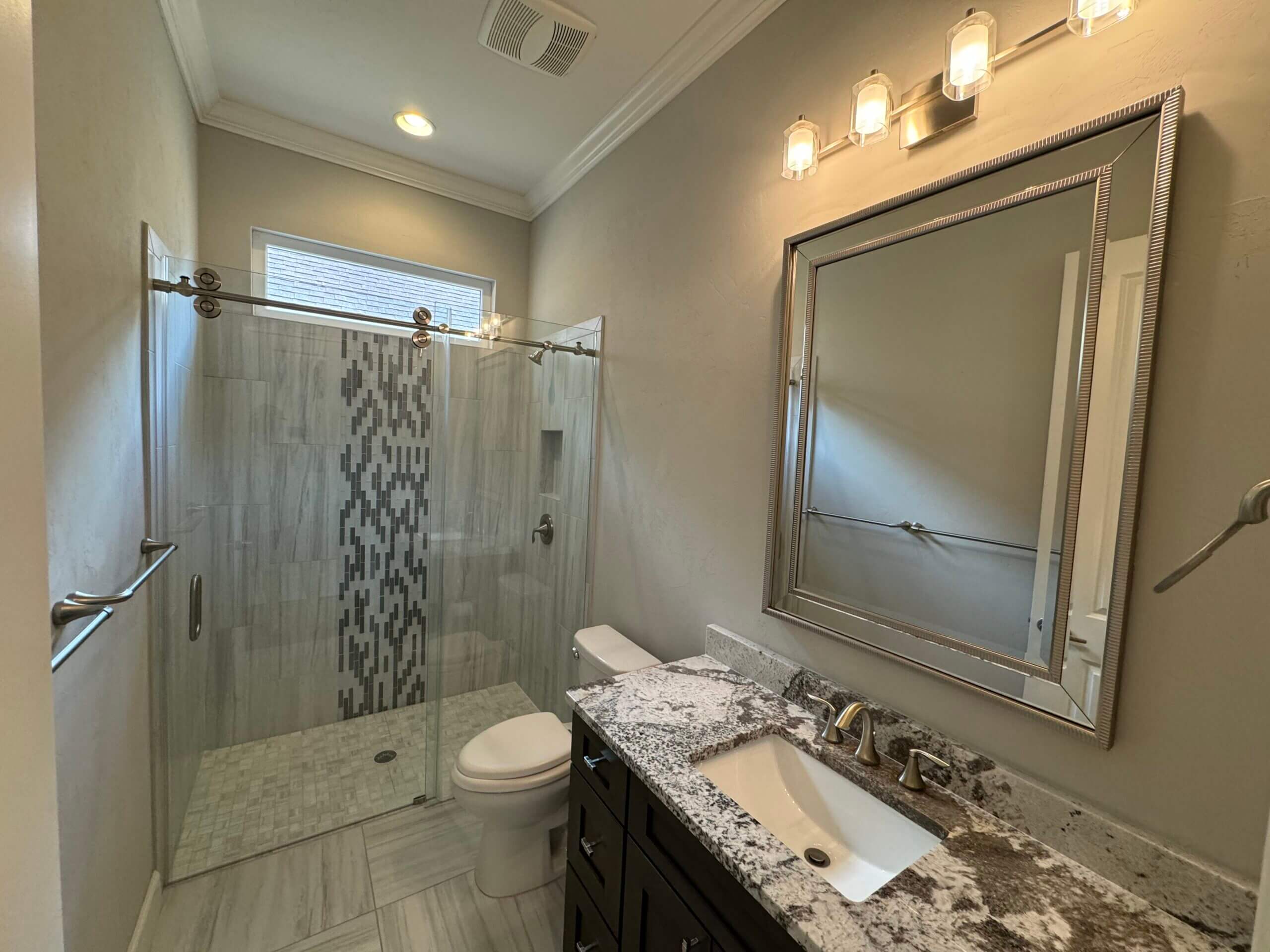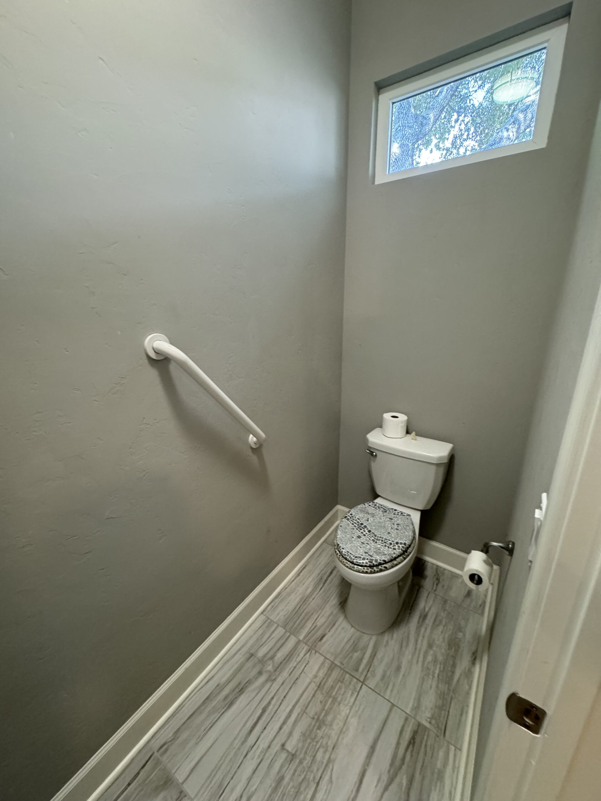 The detached guesthouse offers a spacious bedroom and full bath.