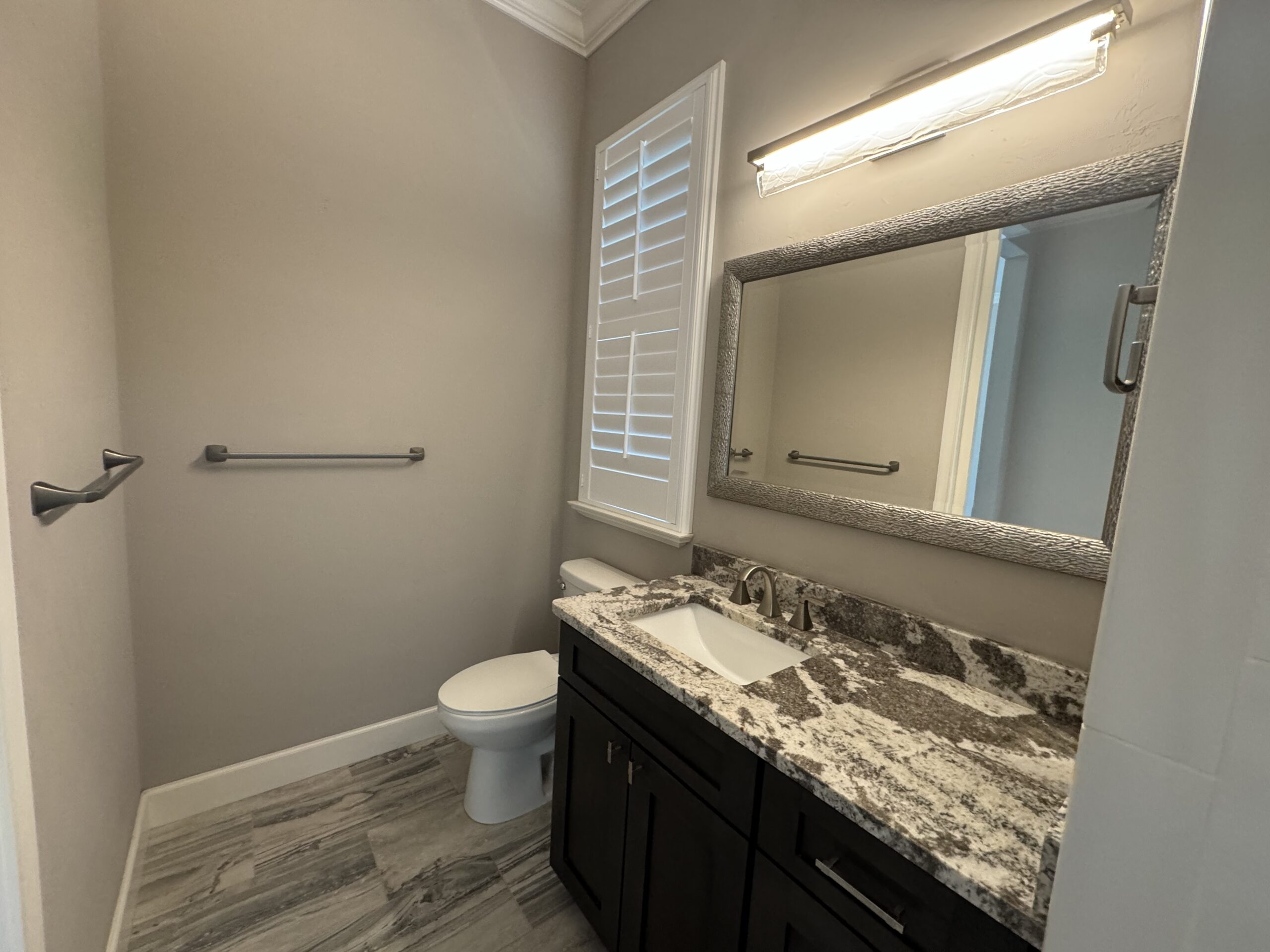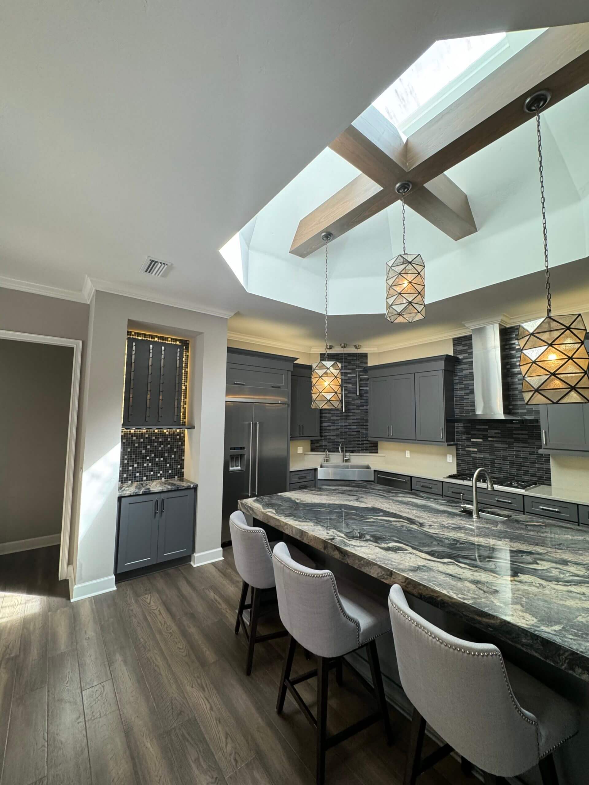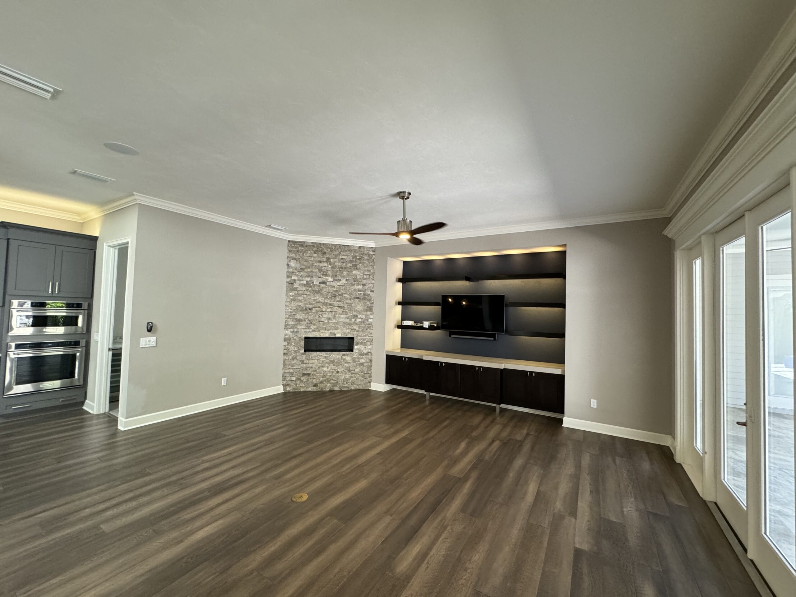 Inside, you’ll find a gourmet kitchen designed for culinary enthusiasts, featuring an exotic quartzite island, built-in coffee maker and cappuccino machine, two dishwashers, double ovens, and dual sinks. The kitchen has an instant hot water tap, and a skylight. Throughout the home, enjoy the warmth of wood floors, ample closet space, and the efficiency of sprayed cell foam insulation and a 4-zone high-efficiency HVAC system. Plantation shutters, a cozy fireplace, and a feature wall with lighted display shelves add to the home’s charm. The professionally finished garage floor and numerous French doors opening to the courtyard reflect thoughtful design and functionality.